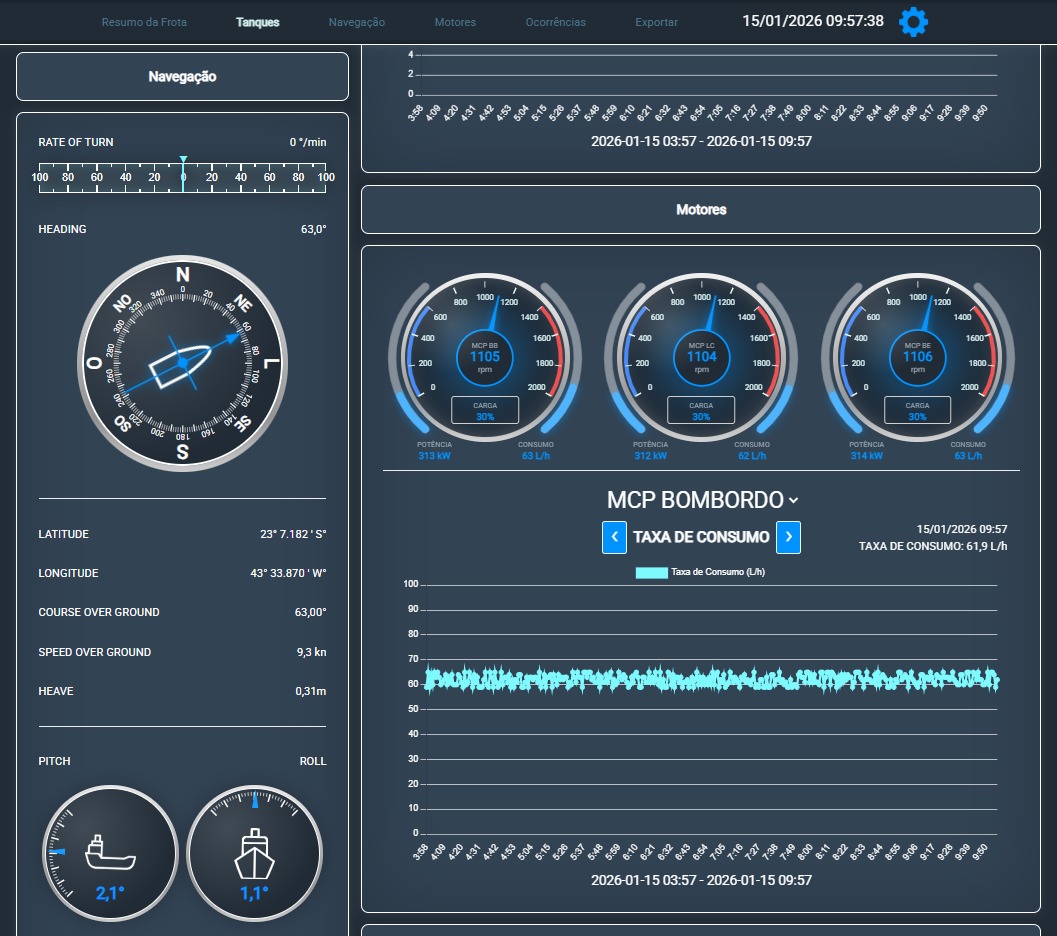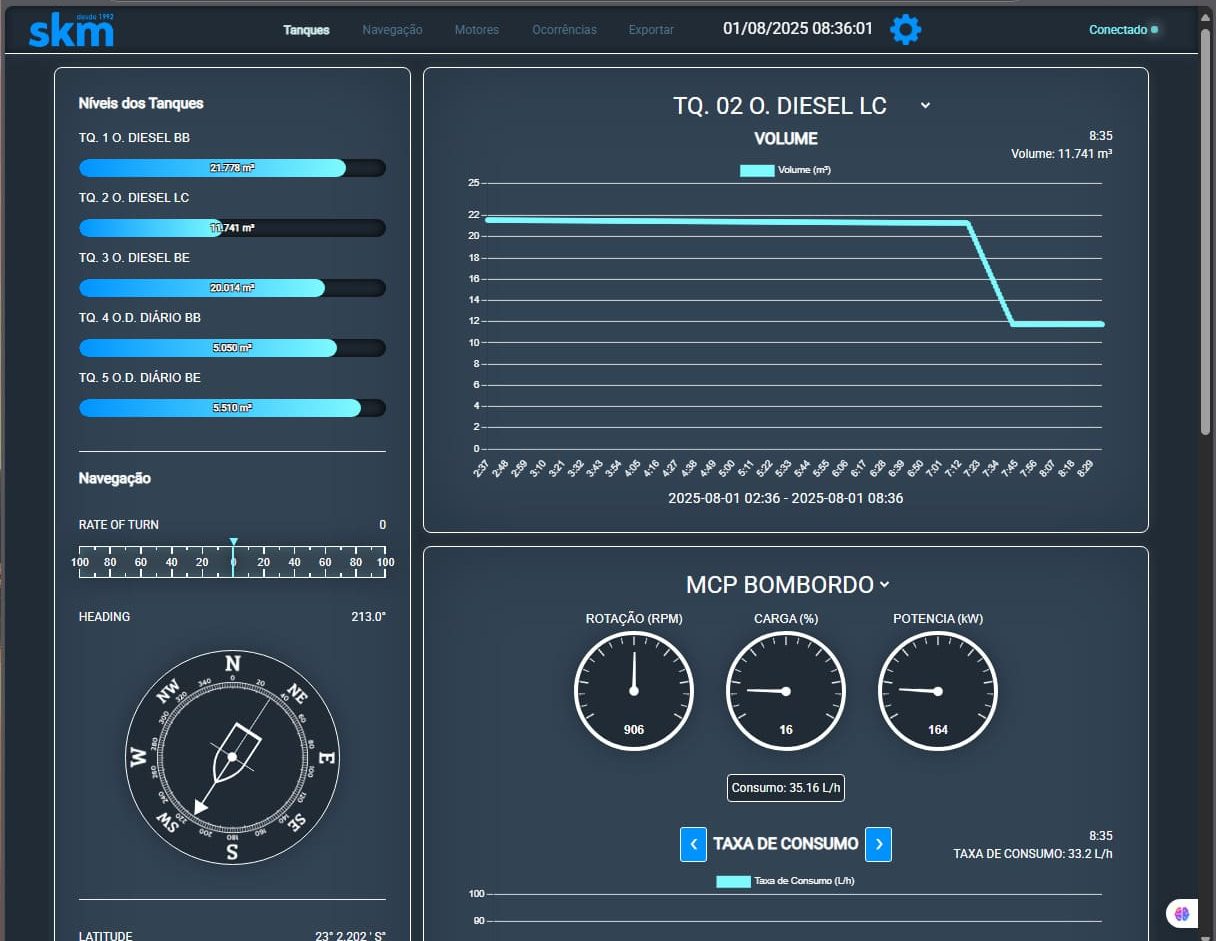 A SKM desenvolve sistemas personalizados de telemetria para monitoramento remoto em contextos navais e industriais. Nosso sistema coleta e analisa dados críticos, provenientes de sensores de máquinas, equipamentos digitais de navegação, como GPS Compass, como inclinação (Pitch, Roll, Heave), velocidade, curso, localização, consumo de combustível, níveis de tanques, rotação, demanda e carga dos motores, consumo elétrico e outros. Os dados são processados e armazenados localmente por pelo menos 30 dias (ou o período selecionado pelo cliente), sendo transmitidos para a nuvem com segurança no momento de disponibilidade de sinal externo.